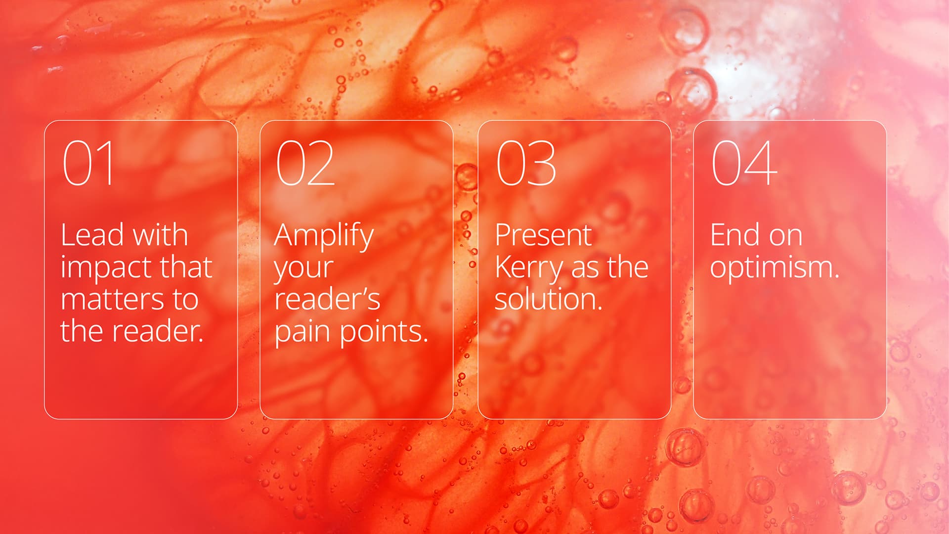 Tone of voice defines how a brand speaks, but a storytelling framework gives shape to what it says. To help teams bring brand messages to life across markets, categories and cultures, we created a simple four-step framework that offers a shared way to structure every story. A pattern that leads with impact, makes Kerry’s unparallelled value clear, and connects science-led innovation to the outcomes it creates in the real world.