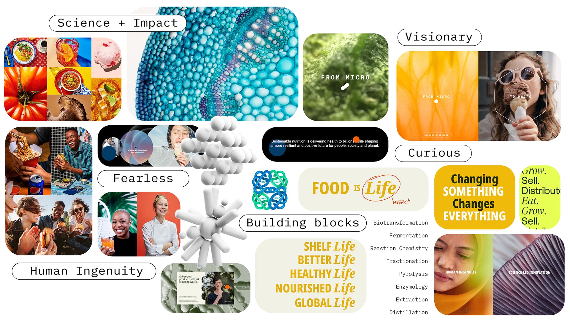 Our visual world is now bolder and more immersive too. Photography is amped up and more cinematic – capturing real-world enjoyment and those epic moments of making, tasting and transforming. We’ve leant into the beauty of science itself, zooming in to a molecular level to reveal the precision and wonder behind the work. Microshapes have been created to denote the microscopic building blocks behind all of the scientific breakthroughs and as visual markers of impact.