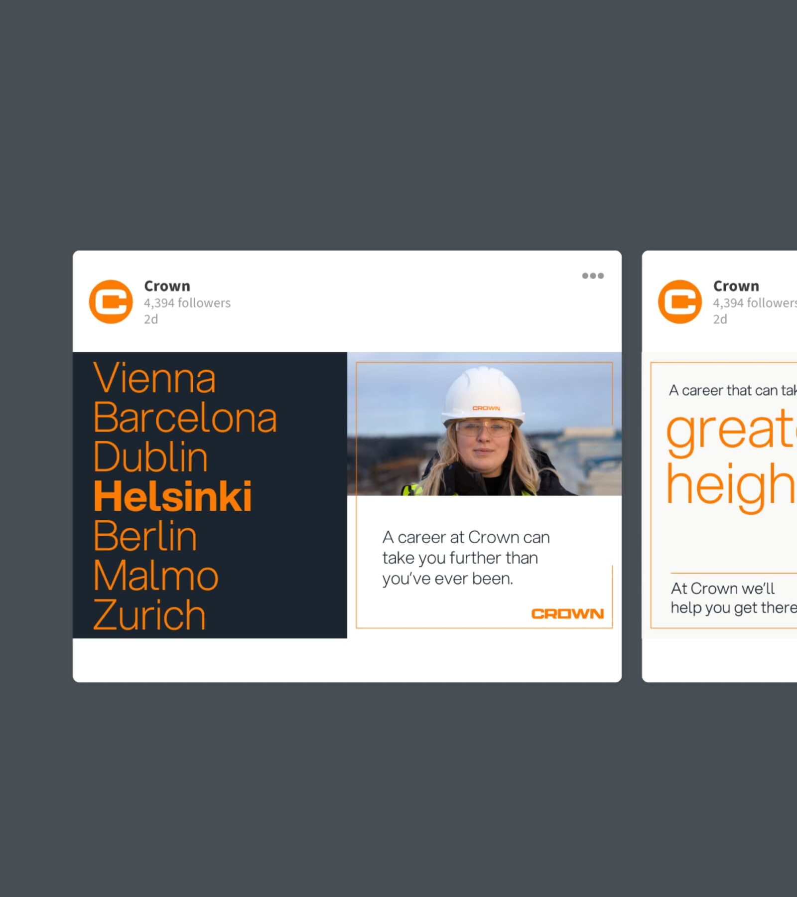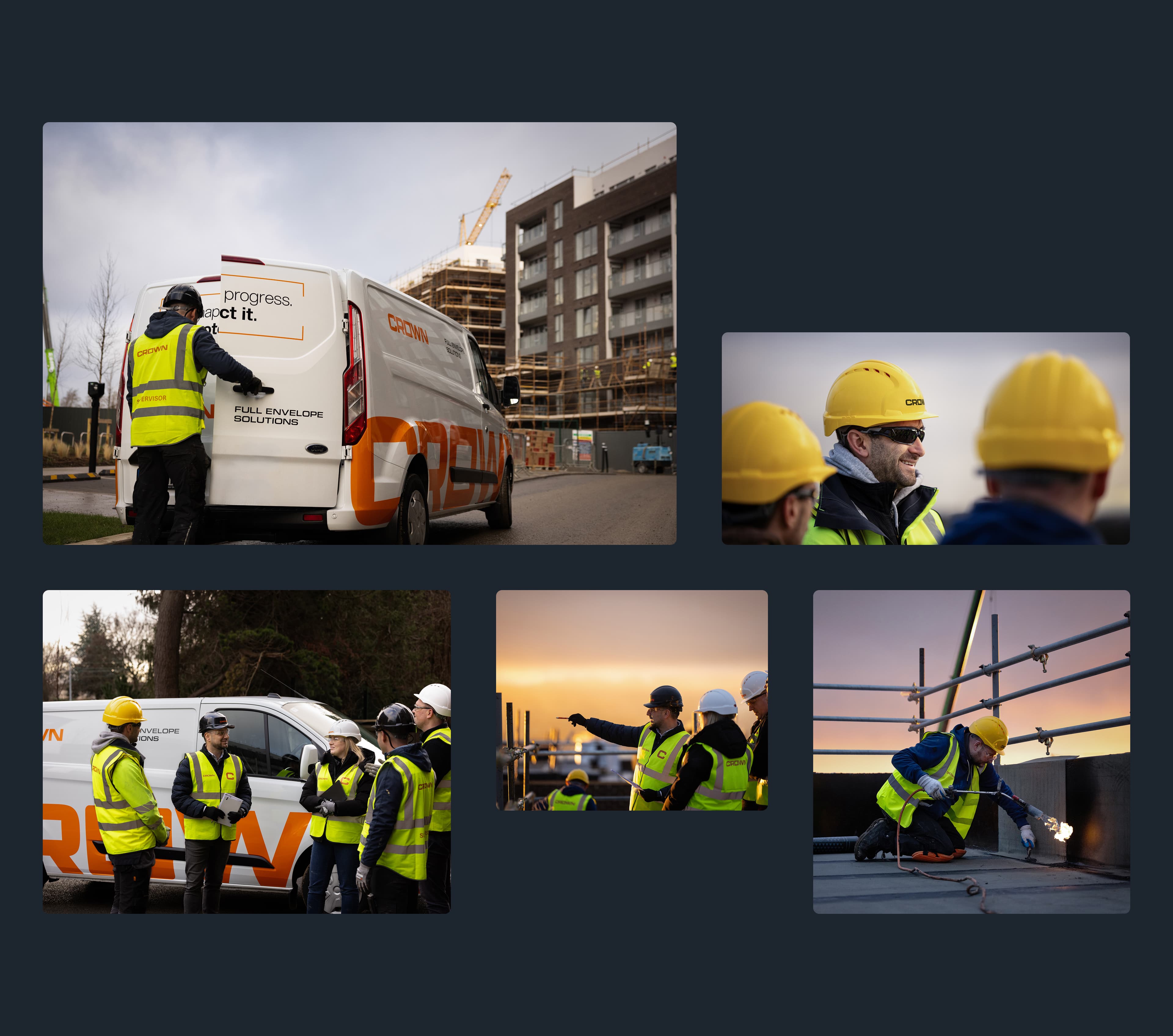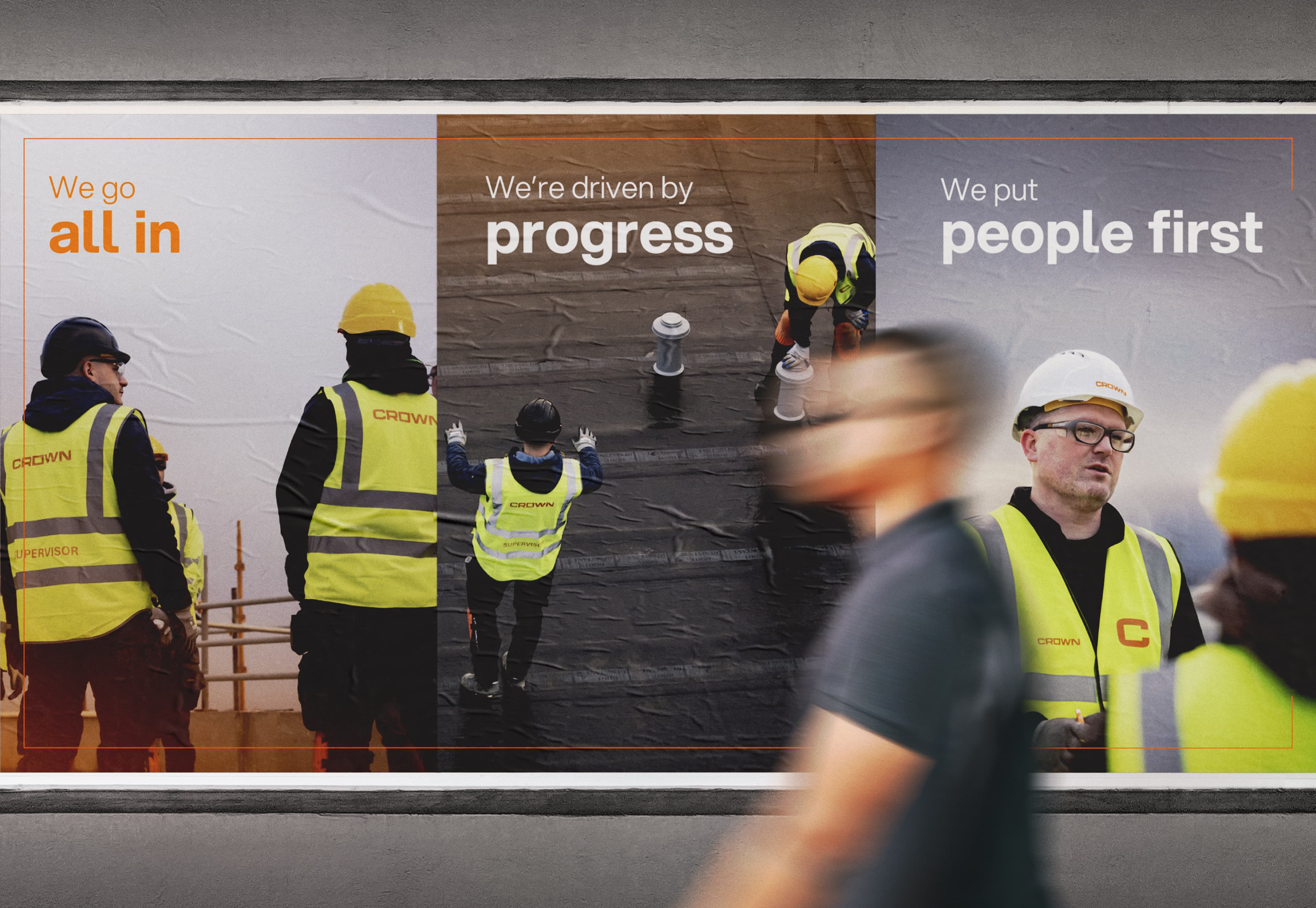 The distinctive C-Frame serves as a framing device taken from the counter of the ‘C’ in the logo. The photography showcases dramatic imagery of their people to emphasise scale and impact, while custom iconography reflects Crown’s technical precision and quality. This contemporary visual system creates immediate impact while offering flexibility across various applications, from digital platforms to on-site branding materials.
